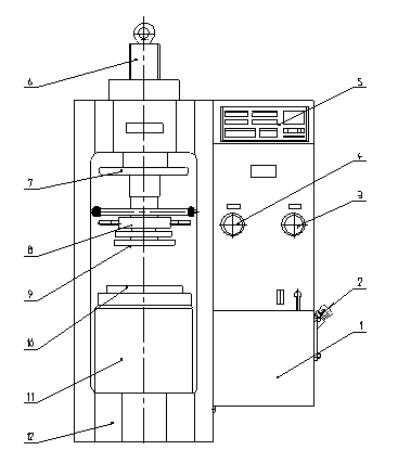 圖中:1—液壓源 2—注油孔 3—送油閥 4—回油閥 5—電測儀表 6—調(diào)節(jié)絲杠副 7—調(diào)節(jié)手輪 8—調(diào)心球頭副 9—上壓板 10—下壓板 11—油缸活塞副 12—機(jī)架